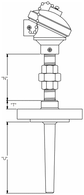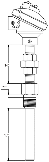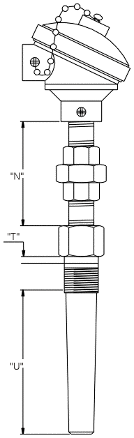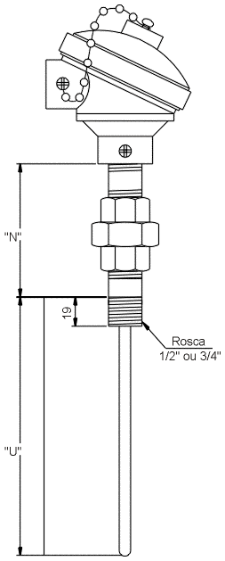 Termopar Mineral Tipo K, simples elemento, bainha inox 310 S ø 6mm junta quente isolada, cabeçote de alumínio a prova de tempo, niple união em aço galvanizado 1/2 x 100mm, comprimento útil – 200mm sem poço.